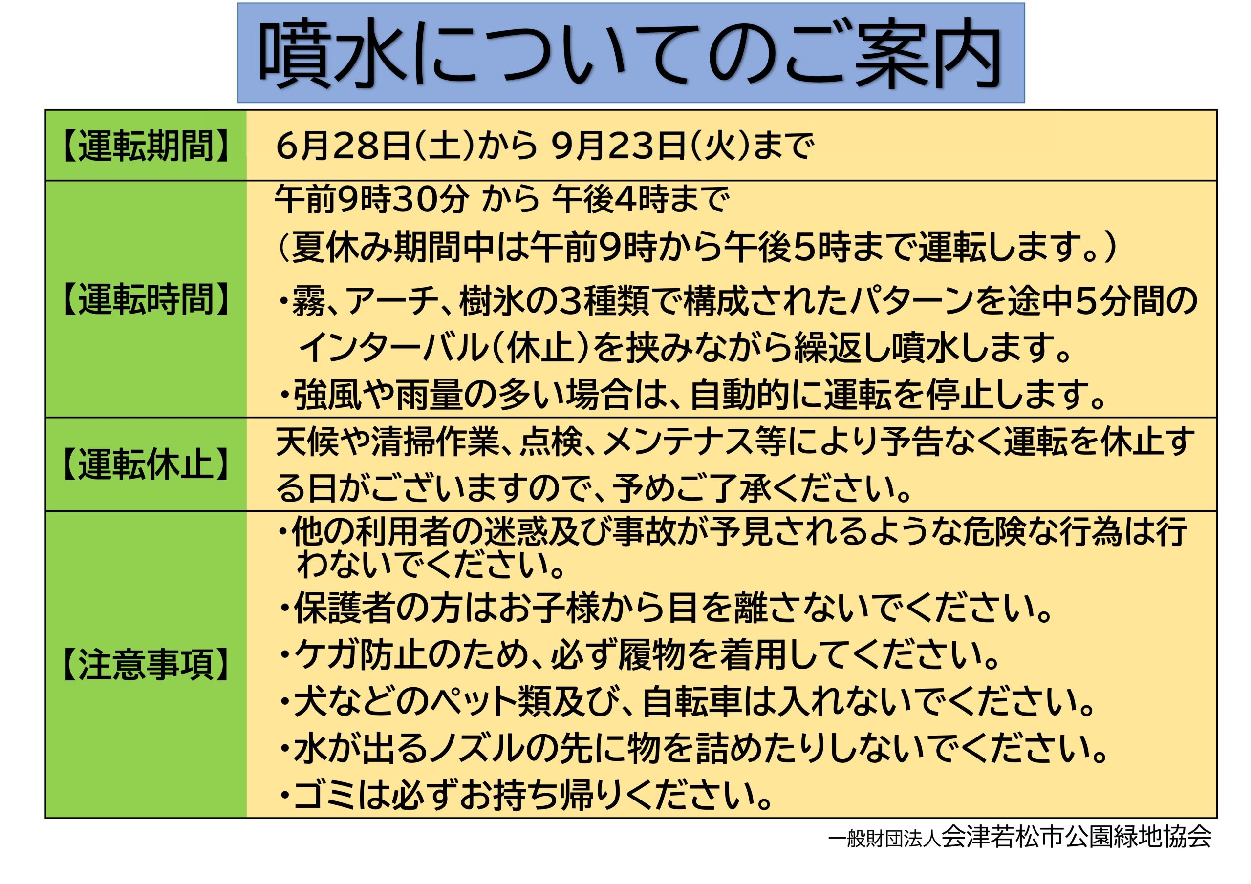 【お知らせ】会津総合運動公園ふんすい広場について 2025年6月23日 ピックアップ情報 日頃より、当協会管理の公園施設をご利用いただきありがとうございます。 会津総合運動公園ふんすい広場についてお知らせいたします。 今年も、会津総合運動公園ふんすい広場の噴水の運転を行います。 詳しくは下記のとおりとなりますので、ぜひご来園ください。