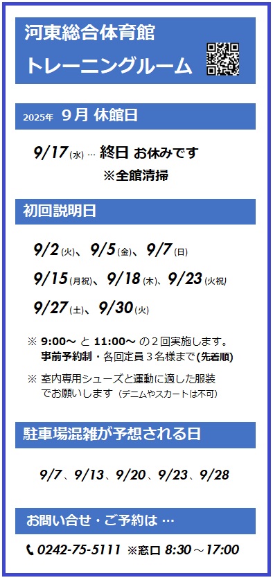 河東総合体育館 TEL 0242-75-5111 受付時間 8:30~17:00