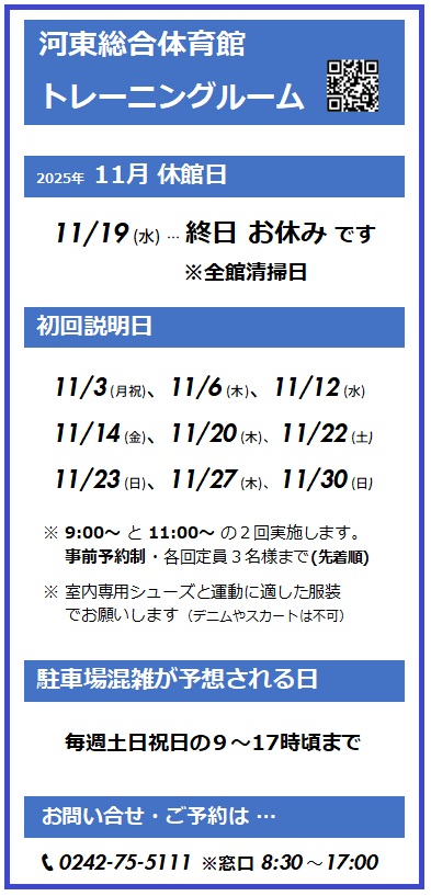 河東総合体育館 TEL 0242-75-5111 受付時間 8:30~17:00