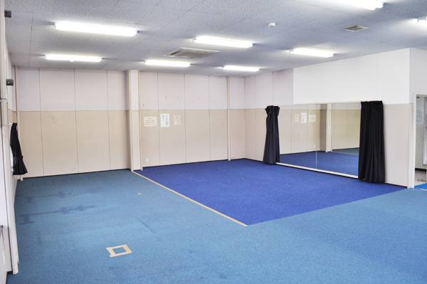 ・じゅうたん敷き、鏡有り 机約25台 パイプ椅子約60脚